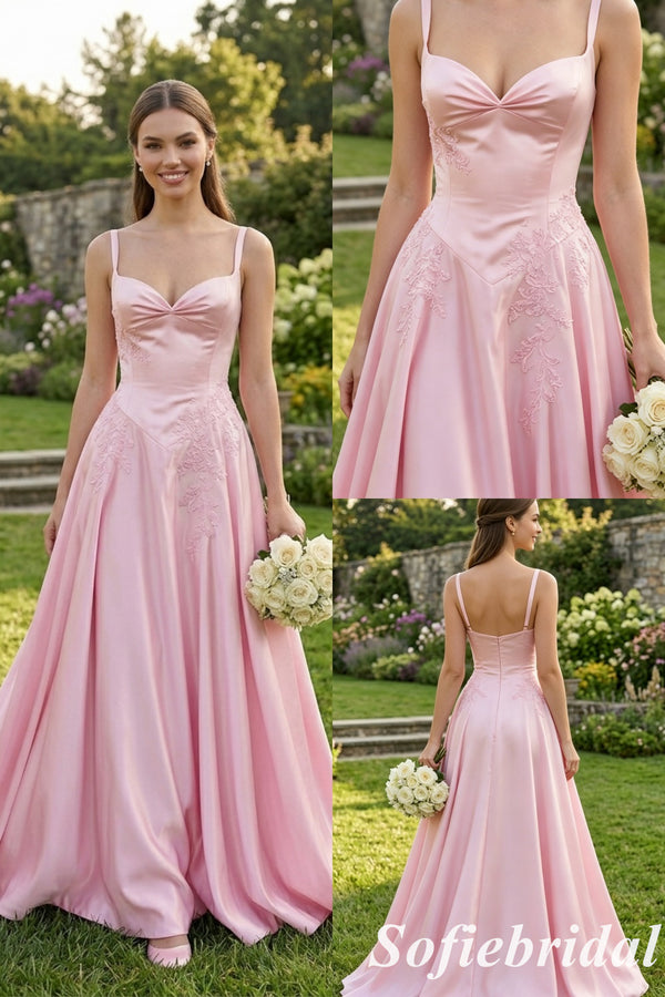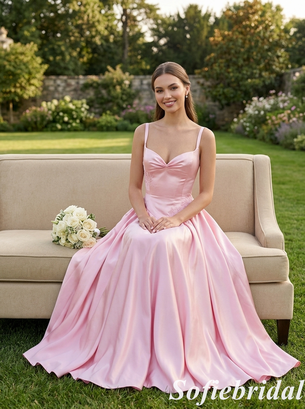 Romantic Blush Pink Satin Spaghetti Strap Lace A-Line Formal Gown, PD01269